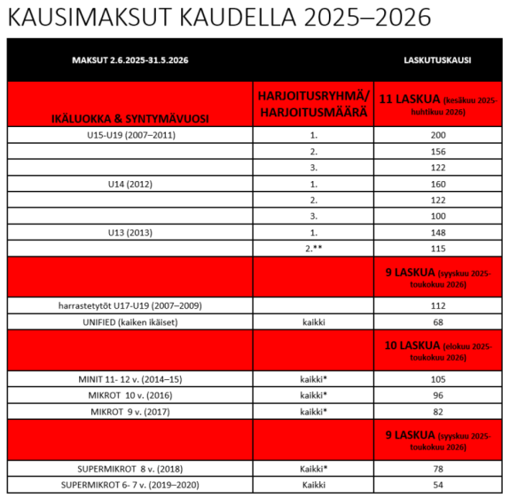 The 2026 association membership fee will be confirmed at the association's 2025 autumn meeting. The membership fee for the current calendar year will be invoiced to all new enthusiasts with the first invoice and from then on the following year's membership fee is always due on February 1st. When starting in January-June, the full membership fee will be invoiced, when starting in July-December, half of the membership fee will be invoiced. (The 2025 membership fee is €50). The membership fee cannot be paid with fitness vouchers. If a player in the U13-U19 (2007–2013) age groups trains in the 1st group, the player must pay the season fee according to the 1st training group.