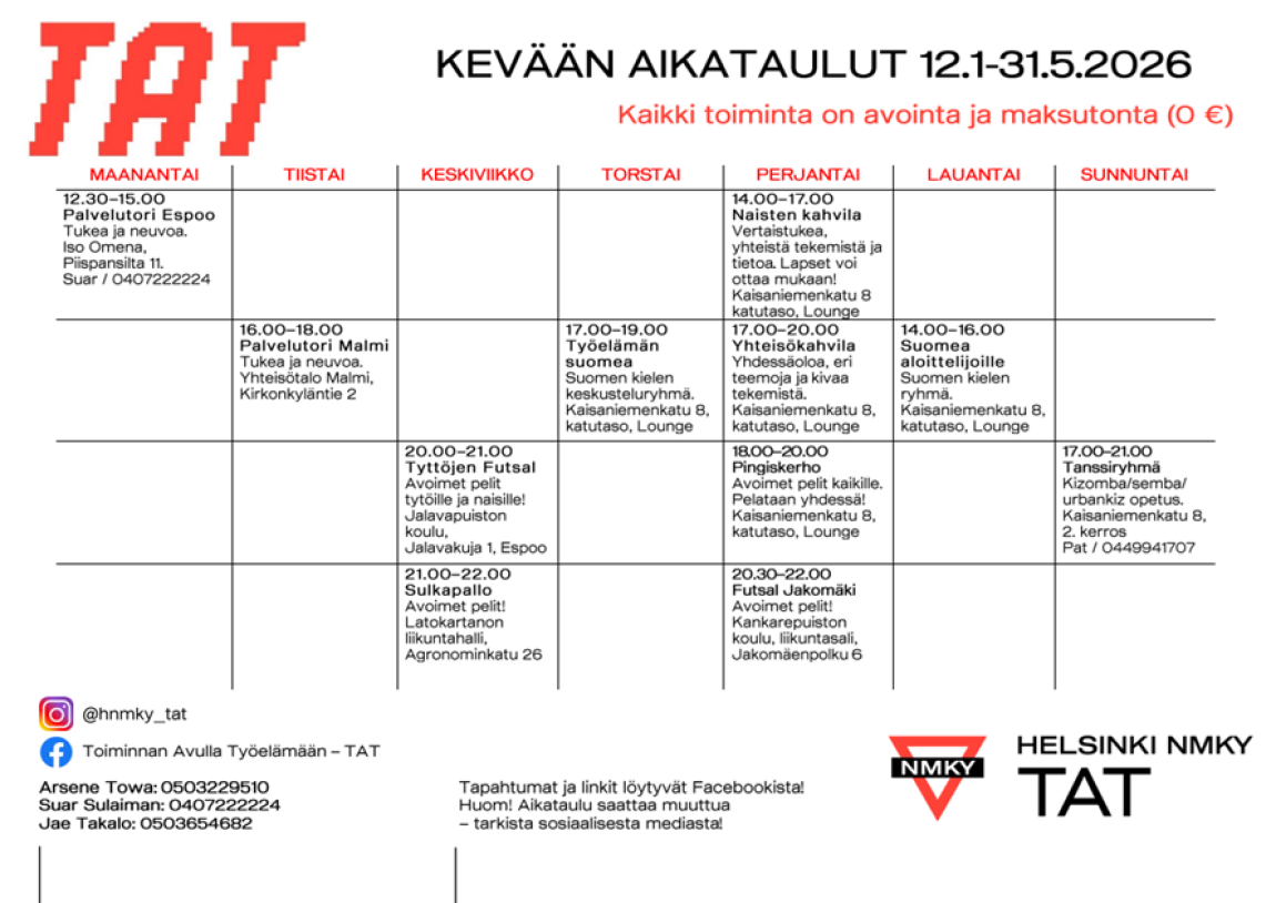 Haluatko löytää työtä? Tarvitsetko apua asunnon saamisessa, KELA-asioissa tai muissa arkisissa asioissa? TAT järjestää työllistymiseen liittyvää ryhmätoimintaa ja kursseja. Tarjoamme myös henkilökohtaista apua ja neuvontaa: voit tulla ilman ajanvarausta Palvelutorille. Palvelemme maanantaisin Espoossa ja tiistaisin Malmilla. Voit myös varata ajan tapaamiseen suoraan ohjaajiltamme: