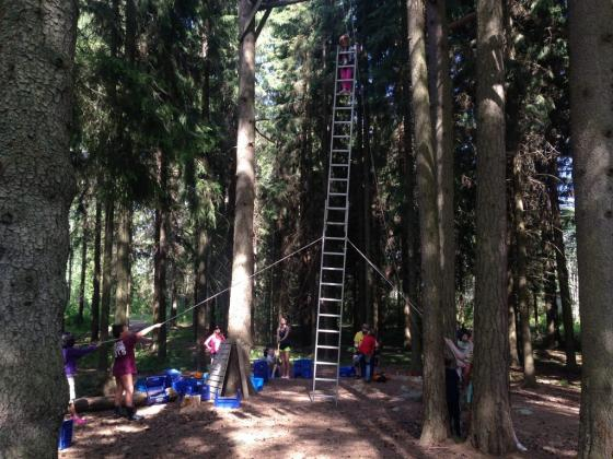 2.   päivä    Ensimmäiseen kokonaiseen leiripäivään mahtui paljon ohjelmaa. Aamupäivällä rakensimme koko leirin voimin yhteisen lautan ja purjehdimme sillä Pellin saaren ympäri. Iltapäivällä kokeilimme tikkaille nousua muiden pitäessä niitä pystyssä, sekä korikiipeilyä. Illalla meloimme vielä Pellin saareen leikkimään piilosta ja paistamaan makkaraa, sekä tikkupullaa.