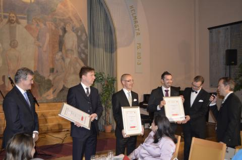 Helsingin NMKY luovutti Aarre Lauha mitalin tasavallan presidentti Sauli Niinistölle 15.1.2015. Kuvassa pääsihteeri Timo Laulaja, opiskelija Maria Piiroinen, hallituksen puheenjohtaja Hannu Niskanen. Etualalla tasavallan presidentti Sauli Niinistö.